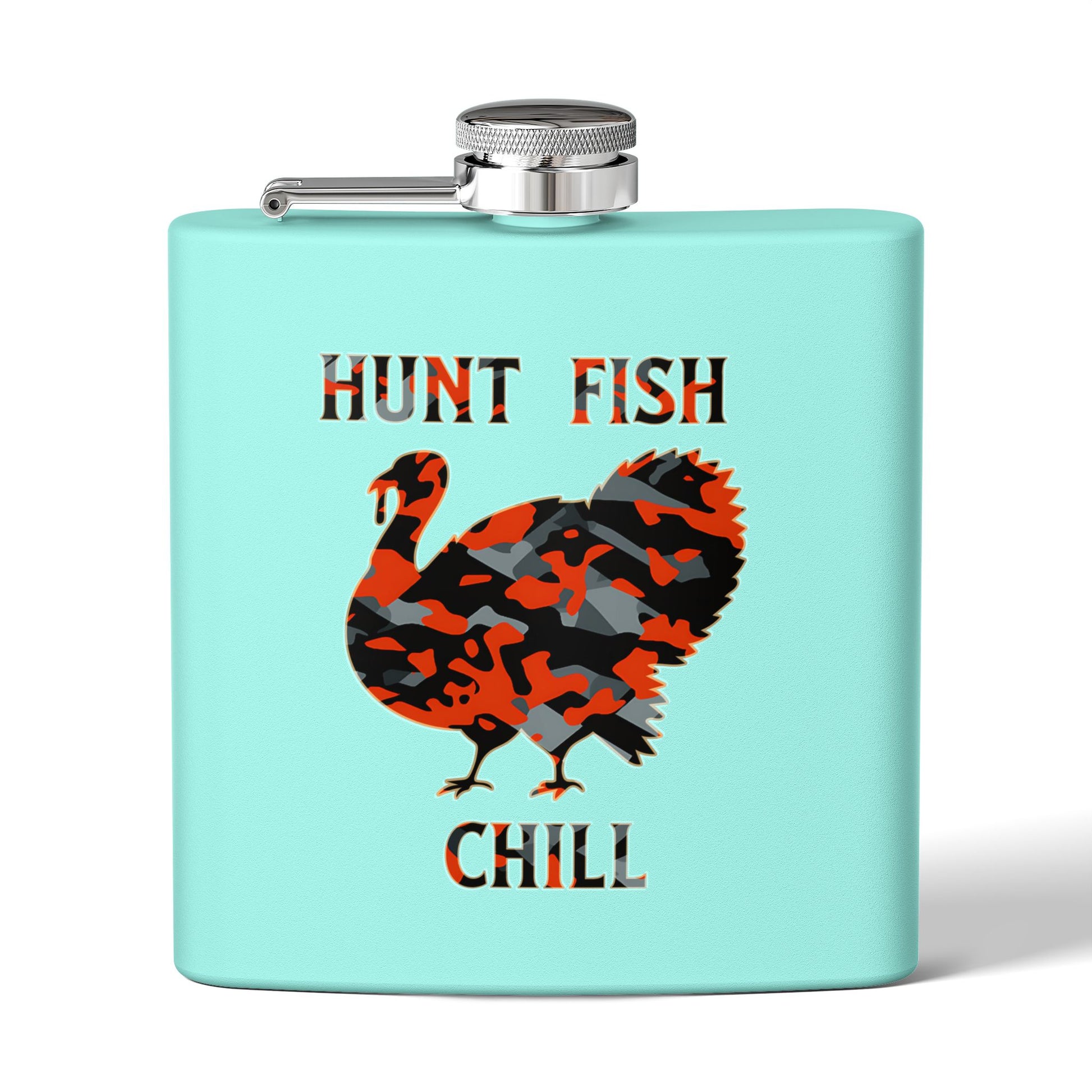 🦃 Hunting-Themed Stainless Steel Flask – “Hunt • Fish • Chill”