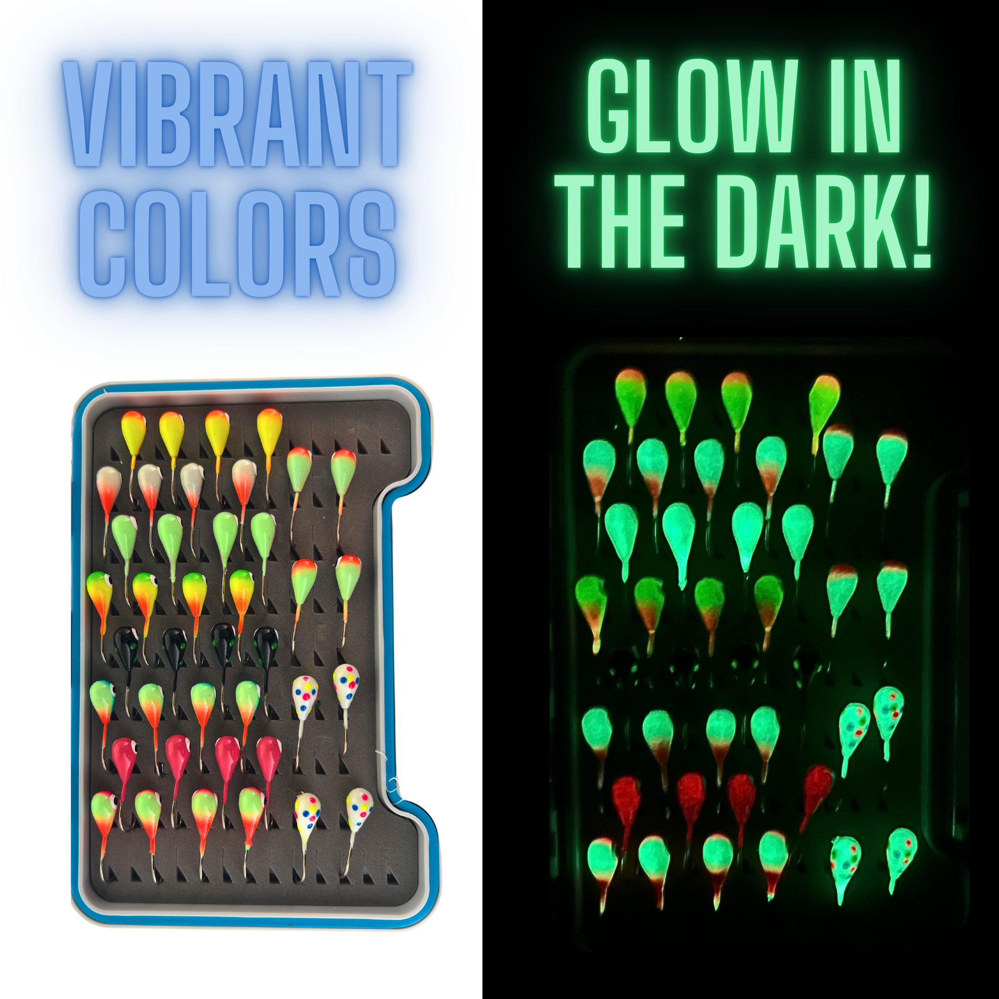 - GLOW EFFECT: Jigs glow with UV light, enhancing visibility and attracting fish in low-light conditions